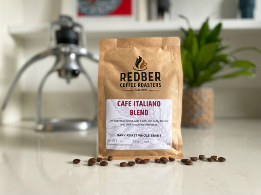 Caffè Italiano coffee beans combine coffees from Colombia, Brazil, Indonesia and Ethiopia. Colombian and Brazilian beans create a smooth chocolate and nutty base, Indonesian coffee adds depth and a subtle smoky note, while Ethiopian beans bring gentle brightness for balance. The result is a full-bodied coffee with chocolate and nutty notes, low acidity and a smooth, lingering finish.