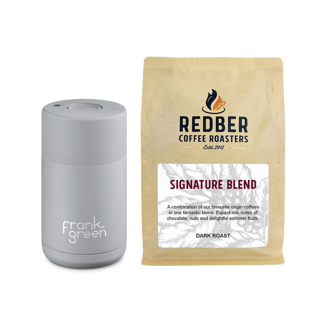 Bundle includes: 1xΒ Frank Green 10oz/295ml Ceramic Reusable Cup and 250gΒ Redber Signature Espresso BlendΒ Coffee.