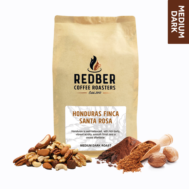 Honduras SHG Finca Santa Rosa Medium-Dark Roast provides a balanced and smooth coffee experience with a well-rounded flavour profile. This roast level highlights the natural sweetness of the beans, featuring notes of cacao, nutmeg, and a bright orange acidity, complemented by a creamy body and a sweet, lingering finish.