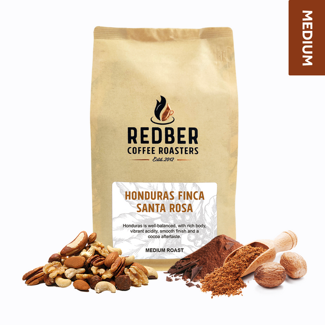 Honduras SHG Finca Santa Rosa Medium Roast offers a bright and refreshing coffee experience with a medium body and a clean, sweet finish. This roast level highlights the delicate notes of cacao, nutmeg, and orange, with a lively citrus acidity that adds complexity and freshness to the cup.