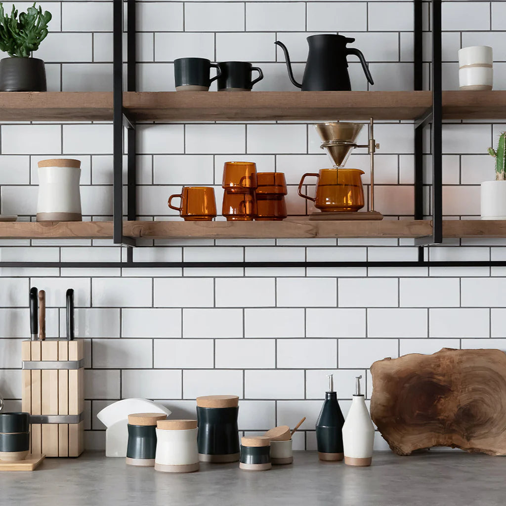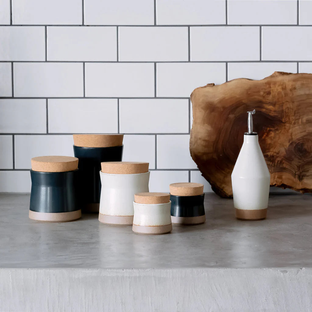 The Kinto CLK-211 Canister 400ml in Black blends artisanal character with everyday functionality. Crafted in Japan from porcelain, this elegant storage container features a rich, deep black glaze over a textured clay body, bringing subtle drama and warmth to your kitchen or table. Its gently contoured shape ensures comfortable handling, while the wide mouth makes scooping, pinching, or pouring effortless. Finished with a nostalgic natural cork lid, it's ideal for storing tea, spices, coffee grounds, or other dry ingredients. Each canister displays unique glaze patterns and natural variations, offering a one-of-a-kind aesthetic rooted in traditional craftsmanship.