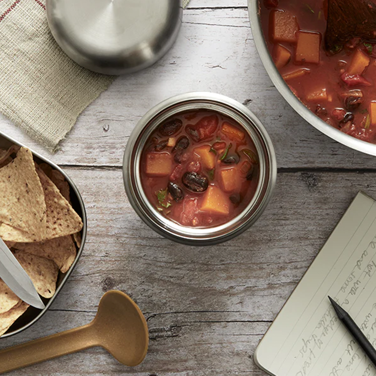 Black+Blum's new and improved 400 ml / 13.5 fl oz vacuum insulated pot that is 100% leak proof and will keep your food hot for 6 hours or cold for 8 hours.