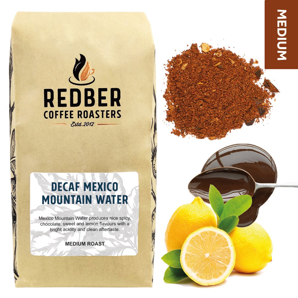 Mexico Mountain Water Decaf Medium Roast delivers a bright and vibrant coffee experience with a clean, refreshing finish. This roast level brings out the sweeter, more delicate notes of the beans, such as chocolate, lemon, and spice, creating a lively and flavourful cup with a bright acidity.