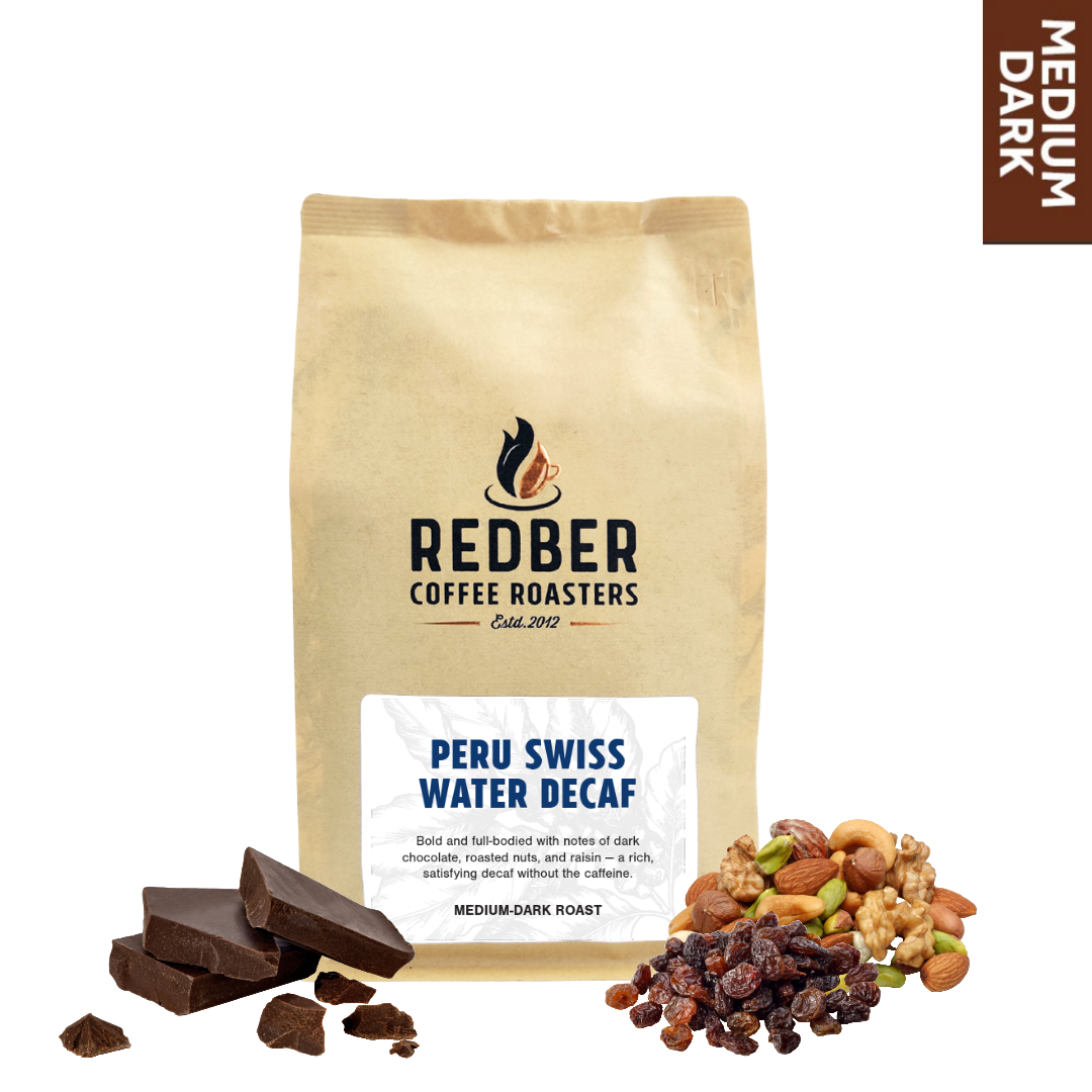 Peru San Martin Swiss Water Decaf – Medium-Dark Roast is a smooth and satisfying coffee that’s full of flavour, just without the caffeine. Roasted to a medium-dark level, it brings out rich notes of chocolate, roasted nuts, and a touch of raisin sweetness. It’s a balanced and comforting cup with a medium body and low acidity — and many are surprised to find it’s a decaf at all when tasted blind.